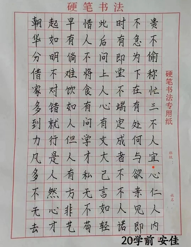 在老师的带领下,在家人的陪伴下,学生们兴趣满满,奋进在求知的征途上。没有课桌,没有黑板,但是我们有笔、有纸,这,就是孩子们最好的学习武器。通过井井有条的线上硬笔书法学习,孩子们磨炼了足够的耐心和毅力,增强了浓厚的学习氛围,同时也很大程度地提高了学生的审美情趣。线上的书法课有难度,课程虽方便,但缺乏的是线下实际教学的氛围。在老师不能当面指导的情况下,也为了克服孩子们怕写不好的胆怯心理,在教学中苏文韬老师运用各种教学方法,让学生们大胆运笔,提高书写质量。在书写过程中逐步展示出书法的独特美、形体美,在感性中提升学生认知,让学生们爱上书法。