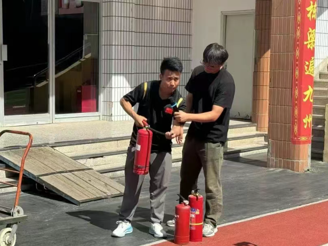 器材使用:由学生处安金喜老师示范干粉灭火器“提、拔、握、压”四步操作法,并拆分消火栓水带连接技巧;