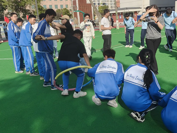 绑腿接力里,几人一组并肩迈步,喊着“一二、一二”的口号保持同步,哪怕脚步稍有踉跄,也会立刻扶住彼此;“一圈到底”时,大家手拉手连成“人链”,呼啦圈从第一个人身上穿过时,有人弯腰配合,有人伸手托扶,全程手不松、队不散,只为让呼啦圈顺利“通关”。