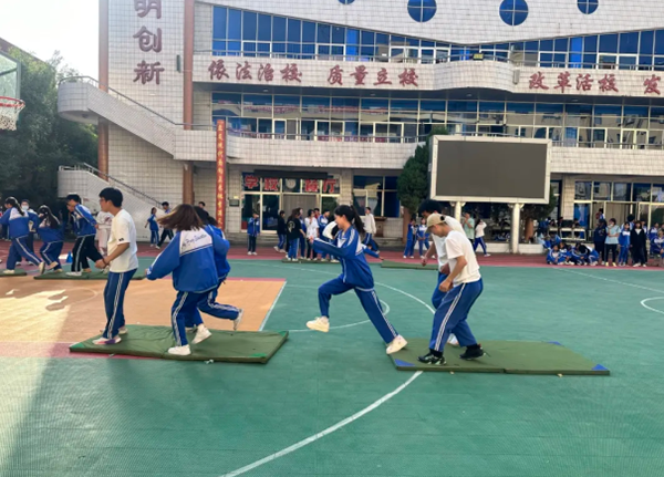 “飞夺泸定桥”项目中,学生们踩着体操垫向前挪动,有人负责快速搬垫,有人小心指挥站位,“左边再挪一点”“快,跟上!”的声音不断,哪怕垫脚空间有限,也没人掉队,只为尽快抵达终点。