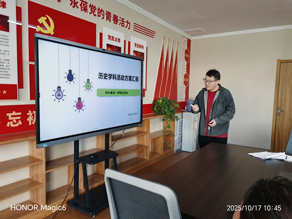 历史教研组:黄明武老师围绕“回归教材 明历史真知”这一主题展开讲解,通过对历史课本知识内容的考察,引导学生回归历史教材,从历史中汲取智慧,理解人类社会发展的多样性。活动旨在激发学生的民族自豪感与责任感,增强文化自信,让学生从历史发展中领悟国家兴衰的规律,树立为国家发展贡献力量的志向。