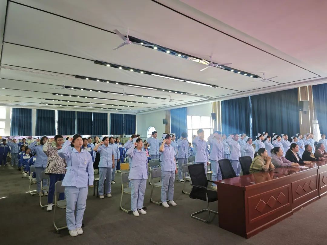 “一顶燕尾帽,一生护理情。”护理教师庄重地为24级学生代表戴上象征纯洁与使命的护士帽。轻柔的动作,饱含着前辈对后辈的殷切期望。随后,全体护理师生庄严举起右拳,齐声宣读南丁格尔誓言。标志着新一批护理学子正式接过传承护理事业的接力棒。