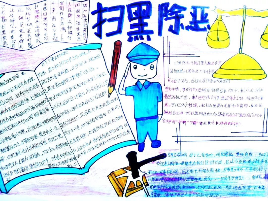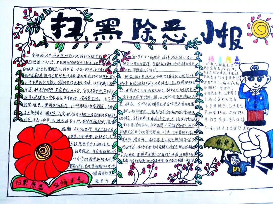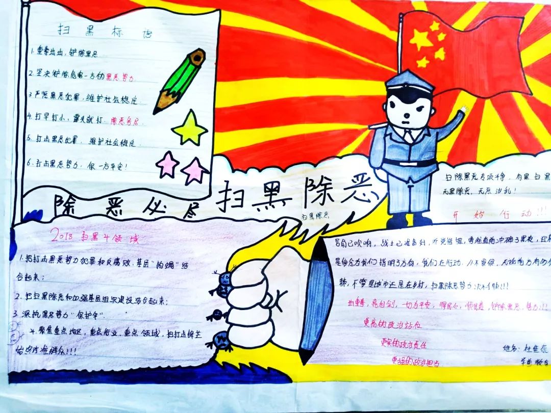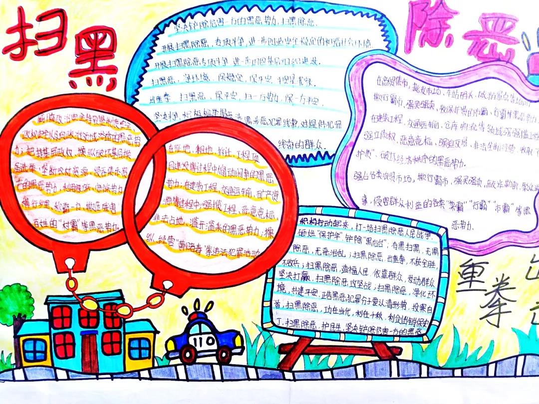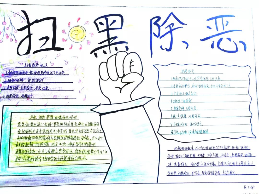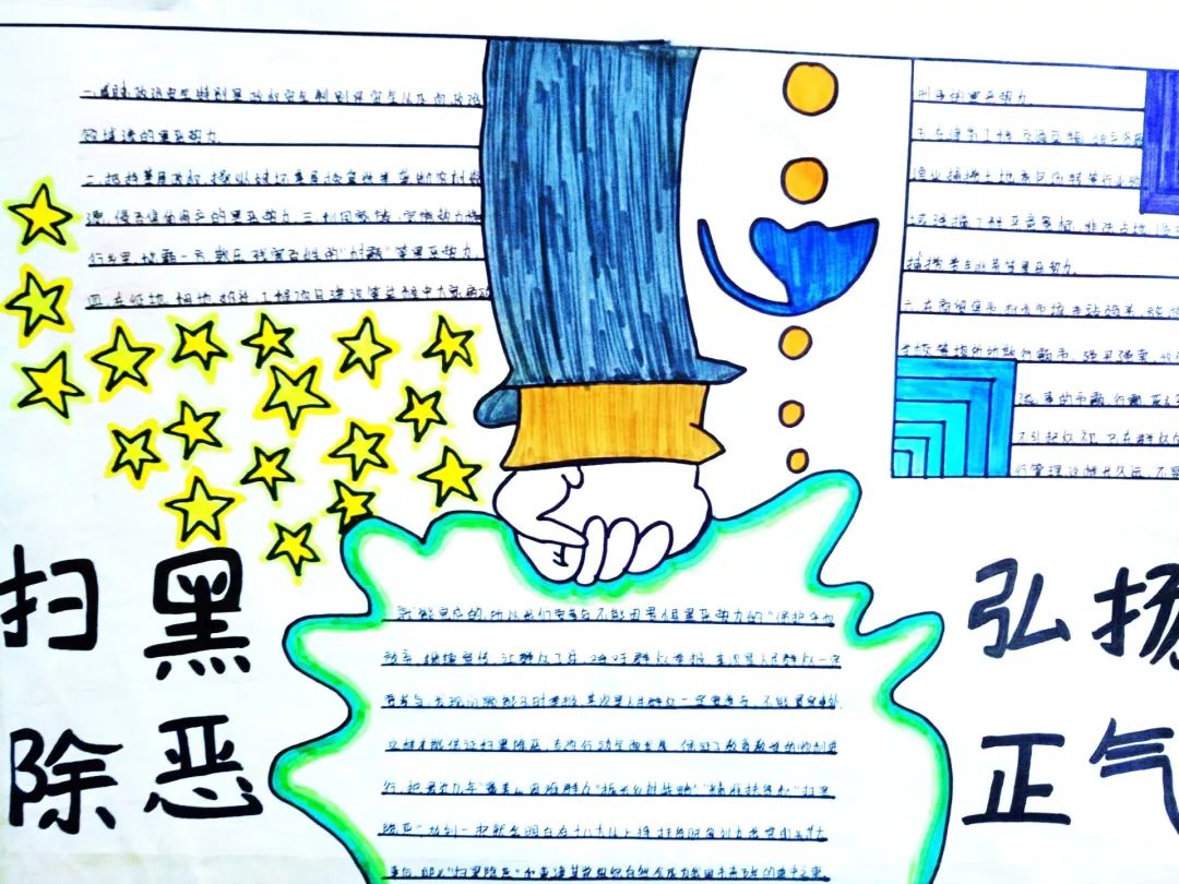通过开展扫黑除恶手抄报活动,同学们用五彩画笔诠释了对黑恶势力危害性的理解,加深了师生、家长对扫黑除恶专项工作的关注力度,让扫黑除恶专项工作深入到每个学生、教师、家长的内心。