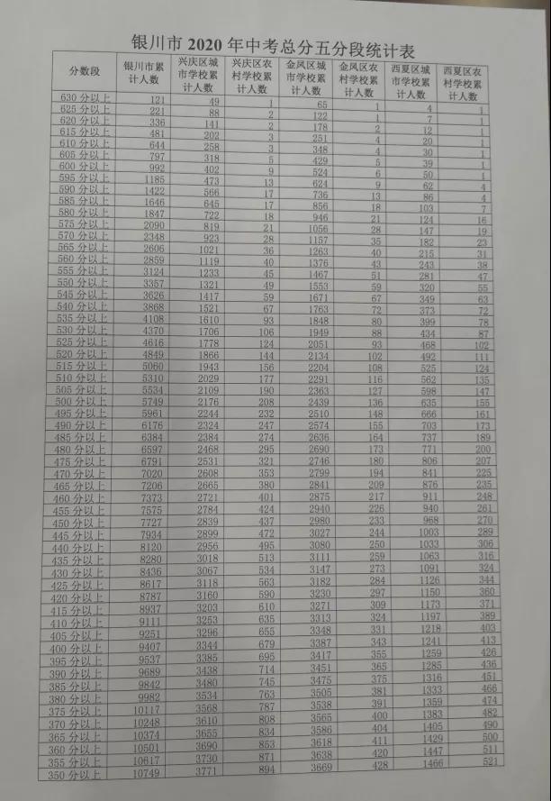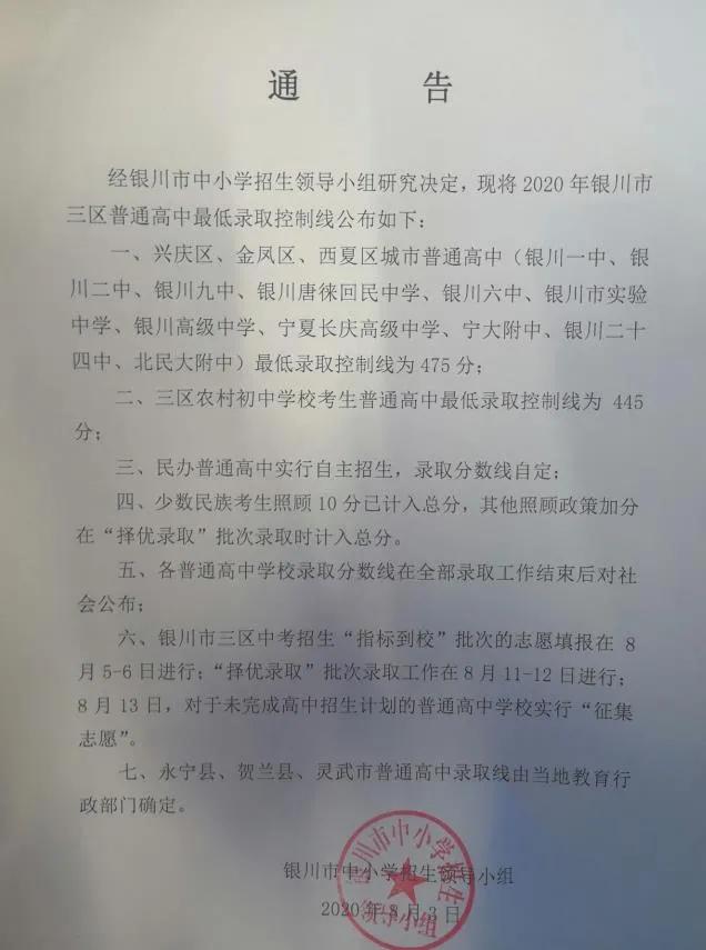 经银川市中小学招生领导小组研究决定,现将2020年银川市三区普通高中最低录取控制线公布如下:
