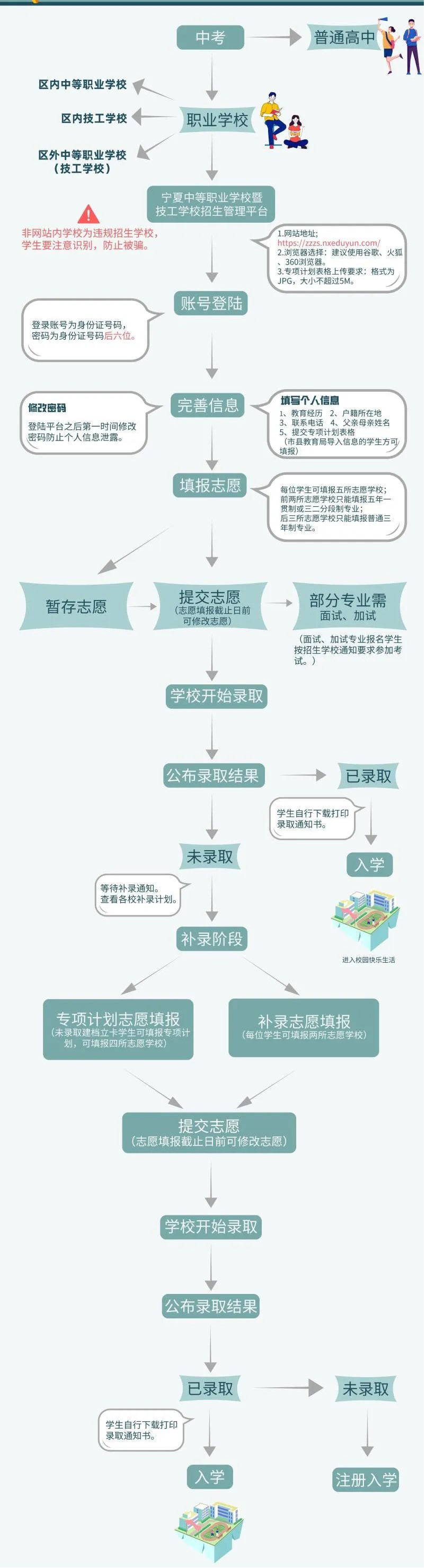 按照《宁夏回族自治区中等职业学校暨技工学校招生工作实施方案(试行)》(宁教职成[2020]98号)要求,参加中等职业学校招生报名的学生在规定的时间内,登录“宁夏中等职业学校暨技工学校招生管理平台”(https://zzzs.nxeduyun.com)填报志愿。