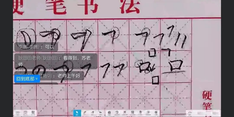 在老师的带领下,在家人的陪伴下,学生们兴趣满满,奋进在求知的征途上。没有课桌,没有黑板,但是我们有笔、有纸,这,就是孩子们最好的学习武器。通过井井有条的线上硬笔书法学习,孩子们磨炼了足够的耐心和毅力,增强了浓厚的学习氛围,同时也很大程度地提高了学生的审美情趣。线上的书法课有难度,课程虽方便,但缺乏的是线下实际教学的氛围。在老师不能当面指导的情况下,也为了克服孩子们怕写不好的胆怯心理,在教学中苏文韬老师运用各种教学方法,让学生们大胆运笔,提高书写质量。在书写过程中逐步展示出书法的独特美、形体美,在感性中提升学生认知,让学生们爱上书法。