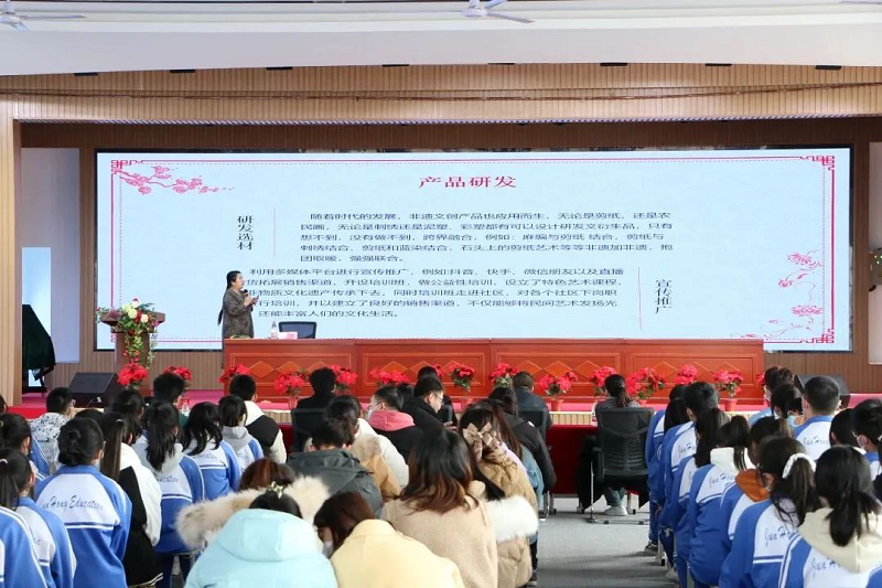 为为深入贯彻党的二十大精神,落实党中央关于职业教育和技能人才工作的决策部署,根据人力资源社会保障部职业能力建设司《关于在全国技工院校开展2023年春季学期开学第一课活动的通知》要求,推广传承中华优秀传统文化,弘扬劳模精神、劳动精神、工匠精神。我校于2023年2月28日邀请石嘴山市惠农区政协委员、宁夏非物质文化遗产代表性项目(剪纸)传承人、石嘴山市宪苓文化传媒有限法人王宪苓老师莅临我校为全体师生作“开学第一课”非遗项目(剪纸)传承人进校园专题讲座。副校长马良玉、党支部副书记李浩、办公室主任王毅、教务处副主任郑海,各年级主任及全体师生现场聆听了讲座。本次讲座活动由幼儿教育专业教研组组长郭丽老师主持。