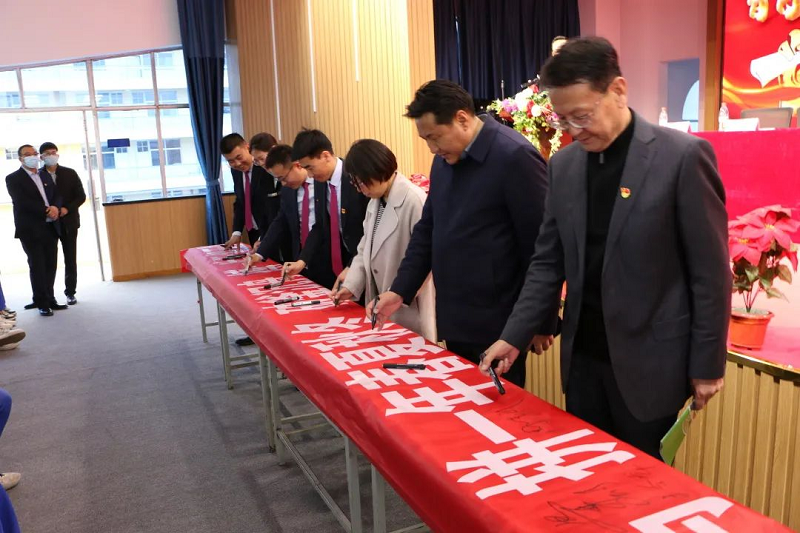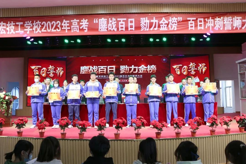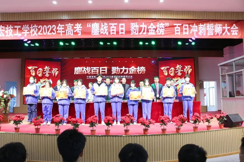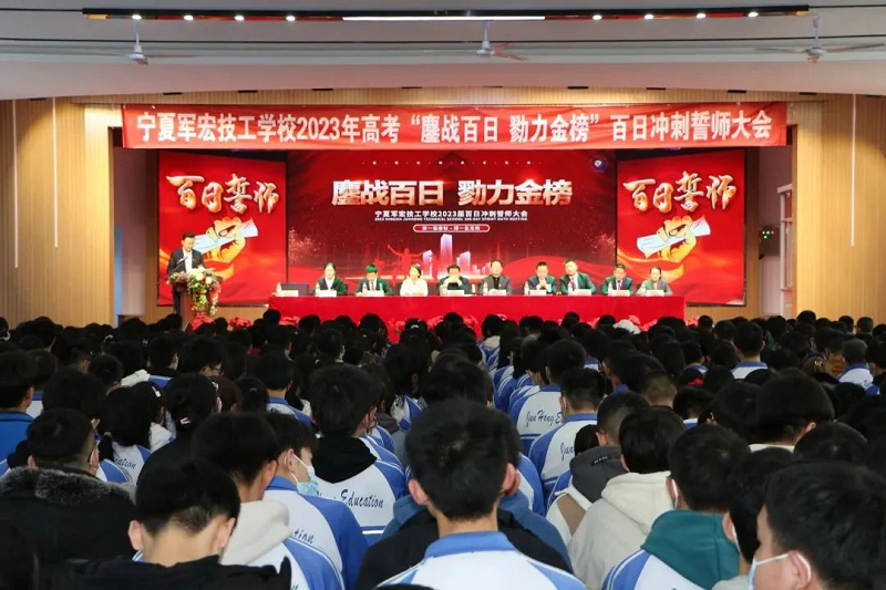 踔厉奋发战百日,笃行不怠迎高考。2023年2月27日下午5点宁夏军宏技工学校全体师生在学校多功能厅隆重举行2023届学生百日冲刺誓师大会。出席本次大会的领导有宁夏军宏教育集团董事长马军宏、宁夏军宏教育集团副总裁徐丽、宁夏军宏教育集团党支部书记周生武、宁夏军宏技工学校党支部书记、常务副校长田勇,校长叶静波,副校长常江,副校长马良玉、副校长王全龙及教务处主任苏响响,本次大会由宁夏军宏技工学校学生处副主任苏文韬主持。