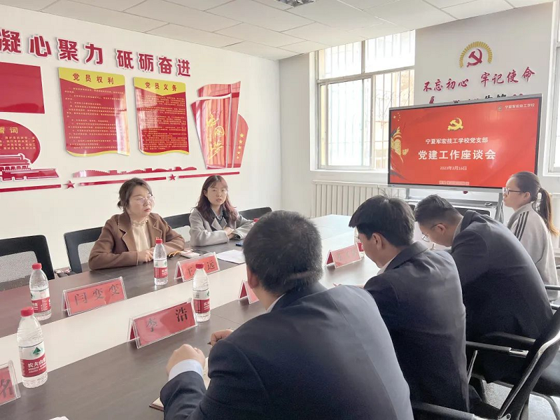在查看完宁夏军宏技工学校党支部阵地建设后,王思远同志在座谈会上对我校阵地建设整体方面给予了充分肯定,对存在的问题也提出了指导性意见。她指出,党支部阵地建设一定要严格按照相关规定和要求进行规范化布置,特别是在党旗的尺寸、党员义务栏等方面要着重对照标准,对存在不符合规定要求的部分要及时整改。她强调,党支部一定要时刻重视党员的思想教育工作,要在教职工中树立以党建为引领的思想,加强理论学习,铸牢理想信念,全力以赴推进党建和业务工作深度融合,特别是对于少数民族的党员同志,要加强学习和领会习近平总书记对民族和宗教工作的重要论述精神,坚定对马克思主义的信仰,坚定对中国共产党的信仰。她希望,在今后的党建工作中,要多学习、多请示,加强与社区和胜利街道党工委的联系,深化党建工作,发挥好党支部的战斗堡垒作用,以党建带团建,充分发挥学校的优势,促进党建和团建工作走深走实。
