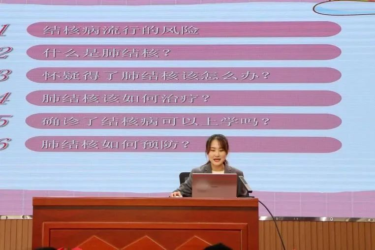 我校护理专业教研组组长周亚琪老师结合PPT深入浅出地向大家介绍了肺结核病的背景、基本知识、临床表现、治疗预防措施等知识。向全体教师、学生大力宣讲传染病防治的重要性,使全体师生提高了认识,同学们对结核病相关知识有了进一步的了解,基本知道了结核病的症状,以及怎样预防结核病。大家纷纷表示将进一步加强个人良好卫生习惯的养成,保持教室干净、整洁。加强通风和班级卫生,为结核病的预防和杜绝传染病在校园内传播做出自己的贡献。