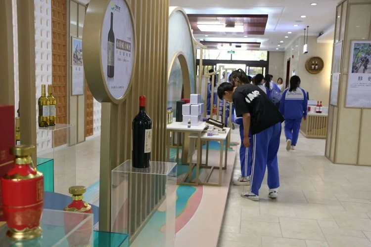 工作人员继续带着学生们参观。在这里展示了西夏王葡萄酒庄不同时代的包装,以及品牌企业的文化,让学生们认识到葡萄酒企业的发展历程和获得的荣誉。
