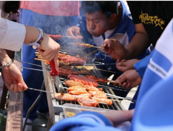 到达目的地后同学们亲自动手,互相合作,在炊烟袅袅中烤制出自己的美味。大家各自拿出看家本领投入到烧烤活动中去——添炭生火,分发食物,烤制美味……大家忙得不亦乐乎,热火朝天。