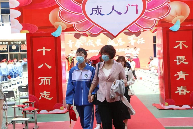 、成长、感 恩、主席台上写着“以青春名义筑梦,以拼搏精神圆梦”,簇拥着“青春、成长、感恩、责任”的仪式主题;会场正中的通道上成人门巍然屹立,在蓝天骄阳的映衬下,绚丽如虹,气势恢弘。仪式由2021级物理老师郭勇全程主持。而 志不畏在工作人员和志愿者学生的引导下,家长们有序步入会场,孩子们全体起立,翘首以盼,迎接父母的到来。