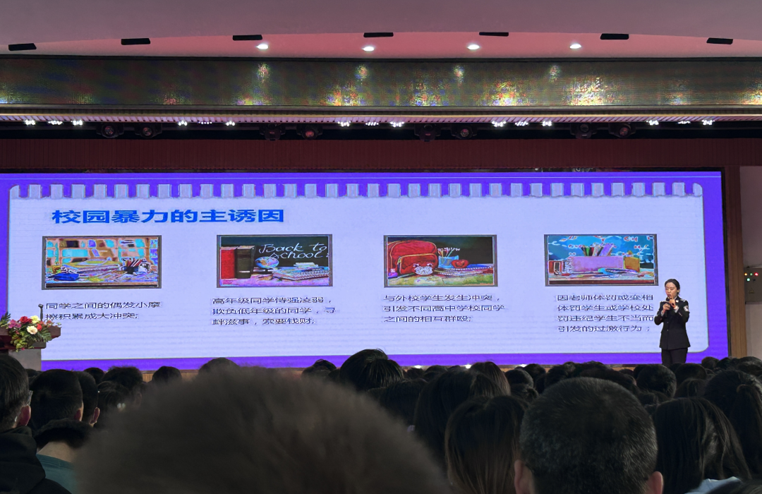 随后,林梦露同志开展了反霸凌、防性侵教育,她围绕校园欺凌和未成年人违法犯罪的因素、校园欺凌对受害者与施暴者的影响,以及如何制止校园欺凌几个方面展开论述。讲座结合中学生实际,分析了当前青少年犯罪原因,同时又列举了实际生活中几个深刻的案例,阐述了预防青少年违法犯罪的重要性。在讲座过程中,林梦露同志与在场的学生积极互动,充分调动了学生的思想认识。通过讲座让同学们清楚地了解不仅要遵纪守法,明辨是非、约束自己的不良行为、远离暴力犯罪,提高法律素质,增强法治观念,还要学会运用法律武器保护自己。