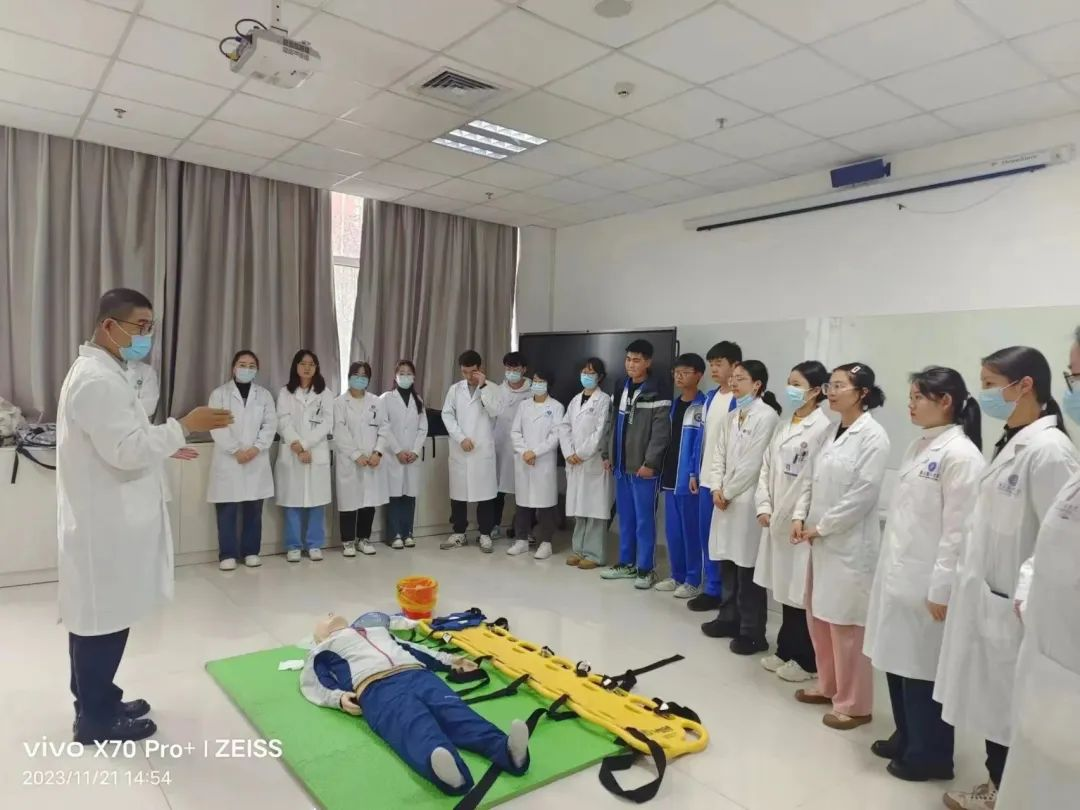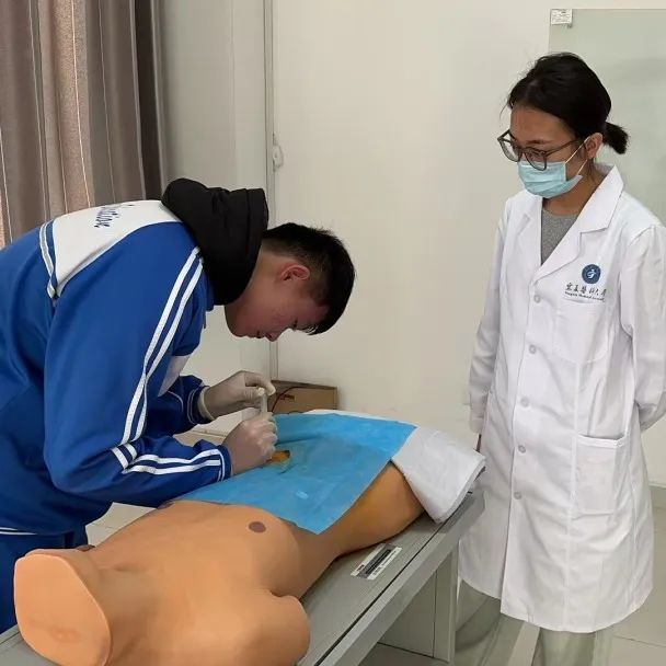 教师主要讲解了腹腔穿刺术的作用,流程,穿刺要求,学生先是观看医科大学长学姐们练习,随后医科大学生指导我校学生实操练习。