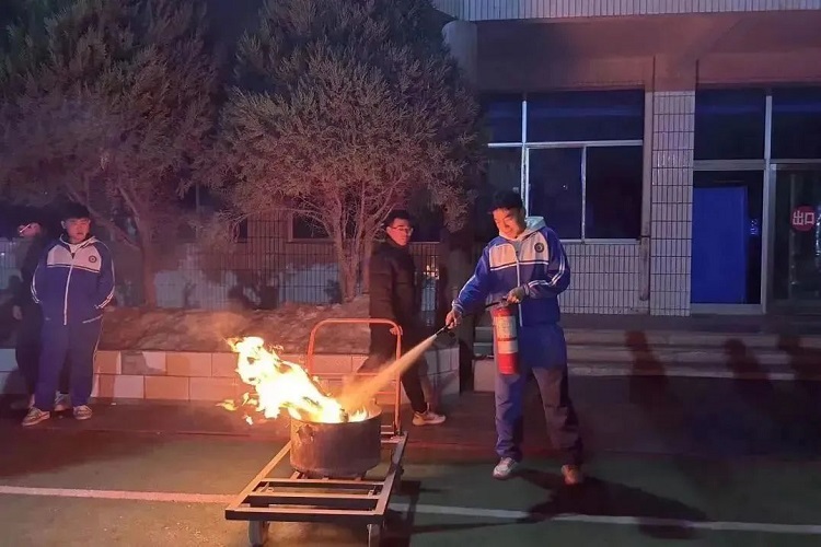 疏散演练之后,常江副校长对本次应急疏散过程进行点评,肯定同学们能在第一时间安全迅速有序地撤离到指定位置。接着,向寄宿生同学介绍了有关灭火器使用的注意事项及使用口诀:一提二拔三瞄四压。提:提起下方手柄;拔:拔出安全插销;瞄:瞄准火源根部;压:压下上方手柄。随后,亲自向学生演示了干粉灭火器的使用过程。部分寄宿生在老师的指导下进行了灭火演练,他们通过自己的亲自试验,对灭火器的使用有了更深刻的认识和了解。