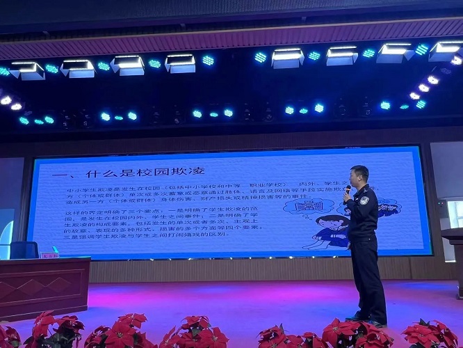 首先尤方伟警官从什么是校园欺凌、校园欺凌的具体表现、校园欺凌的危害及后果等方面向同学们作了详细的解读,并通过真实案例使同学认识到如何正确应对校园欺凌。