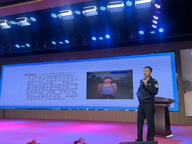 紧接着尤警官就校园盗窃进一步向同学们普及。通过鲜活的案例让同学们明白违法犯罪会受到法律的处罚以及后果也会给家庭和个人带来极大的伤害。增强法律意识,树牢底线思维,以对法律敬畏之心,对家人和自己负责之感,真正做到知法、懂法、守法。希望每一位同学都能够依法律己,抵制校园欺凌,提高自我安全防范意识。
