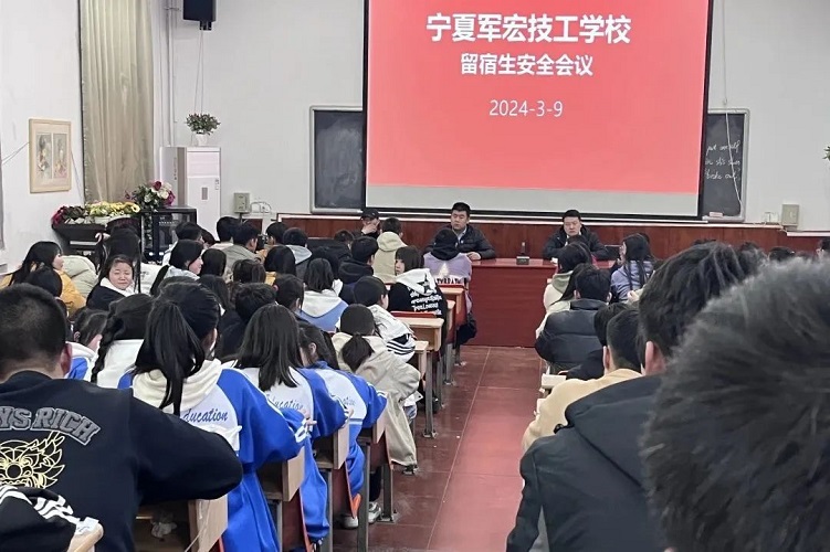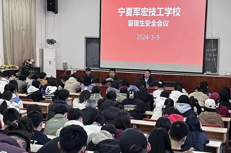 为严格贯彻落实学校留宿学生安全工作要求,维护学校的安全稳定,增强留宿学生的安全防范意识和应急避险能力,宁夏军宏技工学校于2024年3月9日晚18:00召开留宿学生安全教育大会。常江副校长、宿管员全体留宿生参会,会议由杨军纳主任主持。