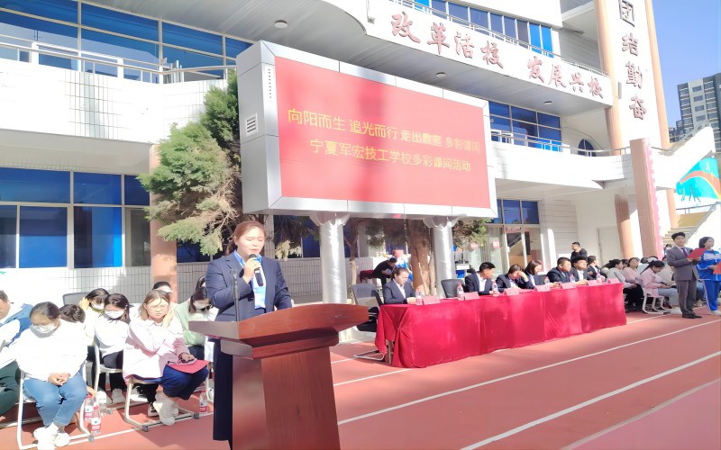 活动开始,展演活动开始之前,宁夏军宏教育集团副总裁徐丽女士致辞,她强调,运动是生命之火,是健康之基,它不仅能够强健我们的体魄,更能磨砺我们的意志,培养我们的团队精神。她希望同学们能够热爱运动,坚持运动,在运动中不断超越自我,在挑战中不断成长,以积极的心态和健康的体魄迎接未来,并祝愿全体学子向阳而生,逐光而行,放飞青春梦想,收获成才希望。