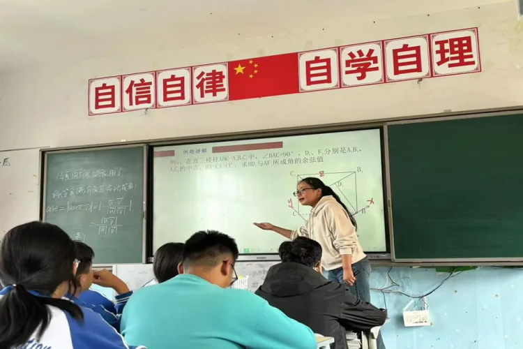 同学们先认真阅读课本,思考并回答课件上的问题,什么叫两异面直线所成角?如何计算?等等问题展开,积极性很高,真正做到了“阅读-思考-表达”的学习模式。底老师非常注重课堂的自主学习和小组讨论,参与到自学指导中,并通过即时检测高效的完成了同学们的纠错与拓展环节。