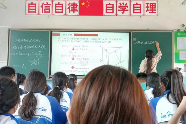 又如在突破两异面直线所成角的余弦值这个重点内容时,底老师先让同学们回顾空间向量数量积的运算,思考两异面直线所成角的余弦值如何计算,并通过实例示范让同学们体会到了数学在生活实际中的应用,时不时来点调皮和谐的小互动让大家感受到教学的艺术,这么高效的课堂,打通了学科知识世界与学生思维世界双通道,真正的做到了为学生造桥铺路。