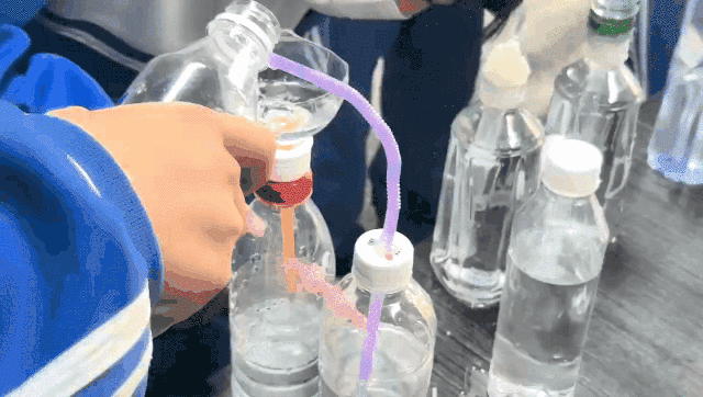 1.压力喷泉组:通过吸管与橡胶塞构建“气压密室”,利用水流的流入或挤压瓶身改变内部压强,驱动水流喷出;