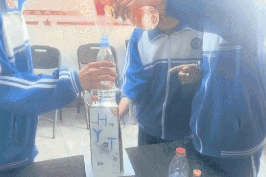 在比赛环节,同学们分组合作,严格按照操作步骤进行。他们开始打开开关和往容器中倒水,当喷泉开始喷发,学生们加的彩色液体喷涌而出时,现场爆发出阵阵惊叹声。同学们在惊叹于物理现象神奇的同时,也锻炼了自己的动手能力。