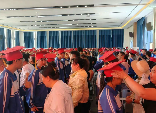 家长们亲手为孩子佩戴成人帽,帽子落下的瞬间,父母眼中闪烁着泪光,孩子们的神情也从青涩转向坚毅。随后,学生代表王一诺带领全体同学庄严宣誓,铿锵的誓言回荡在会场:“以成人之名,担时代之责,用拼搏书写无悔青春!”