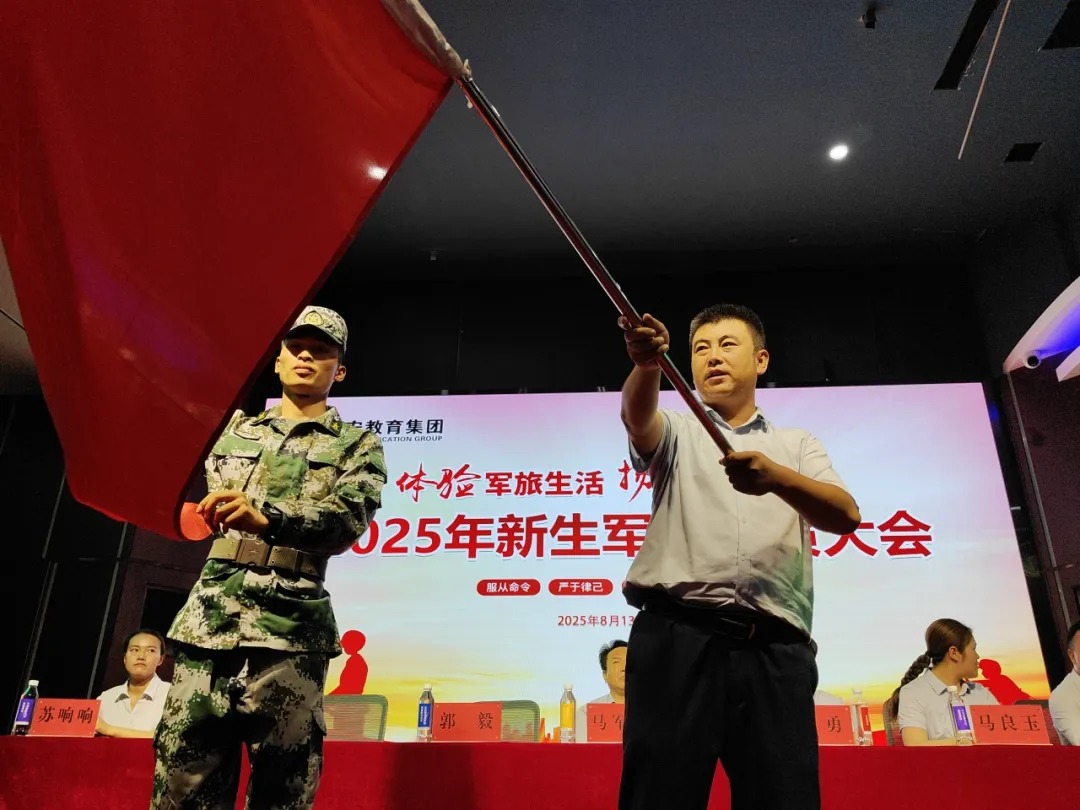 常江副校长与郭毅教官共同完成授旗仪式。当鲜艳的旗帜交到教官代表手中,也意味着一份沉甸甸的责任——那是对集体的承诺,更是对自我的挑战。
