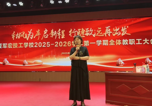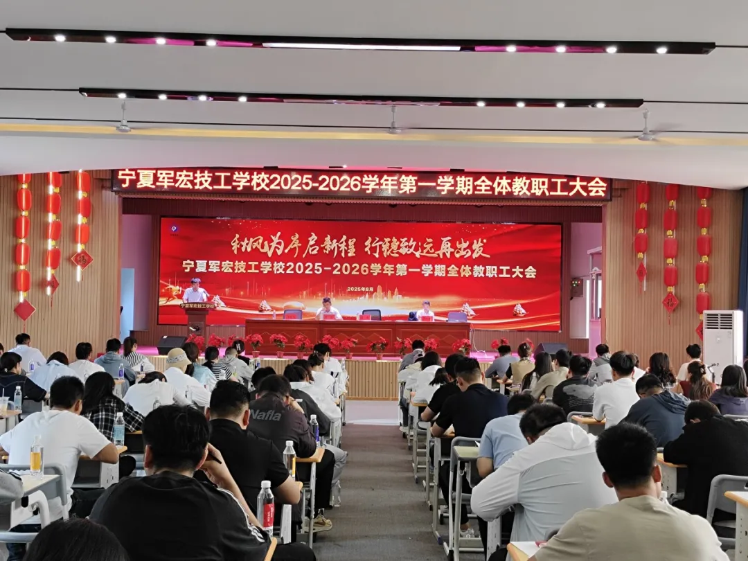 金风送爽的八月末,微风拂过学校门口的树梢。8月22日宁夏军宏技工学校2025-2026学年第一学期全体教职工大会在学校多功能厅召开。会议由马良玉副校长主持,全体教职工以饱满的精神状态共赴这场“教育之约”,共绘新学期发展蓝图。