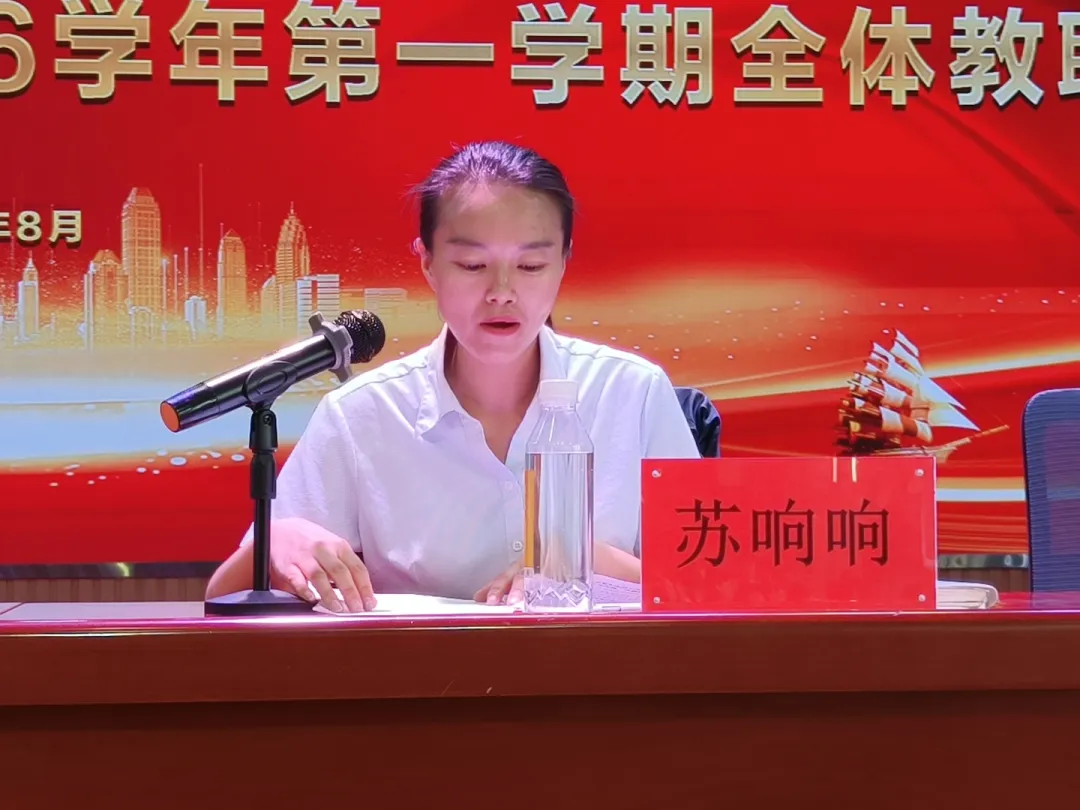 苏响响助理宣读2025-2026学年各年级教师安排决定。她表示,本次师资调配坚持“老中青结合、学科均衡、优势互补”原则,“既让经验丰富的骨干教师引领团队,也为青年教师搭建成长平台”。她呼吁全体教师:“以‘全校一盘棋’的大局观,打破年级、学科壁垒,共同为学校教育质量提升贡献力量。”